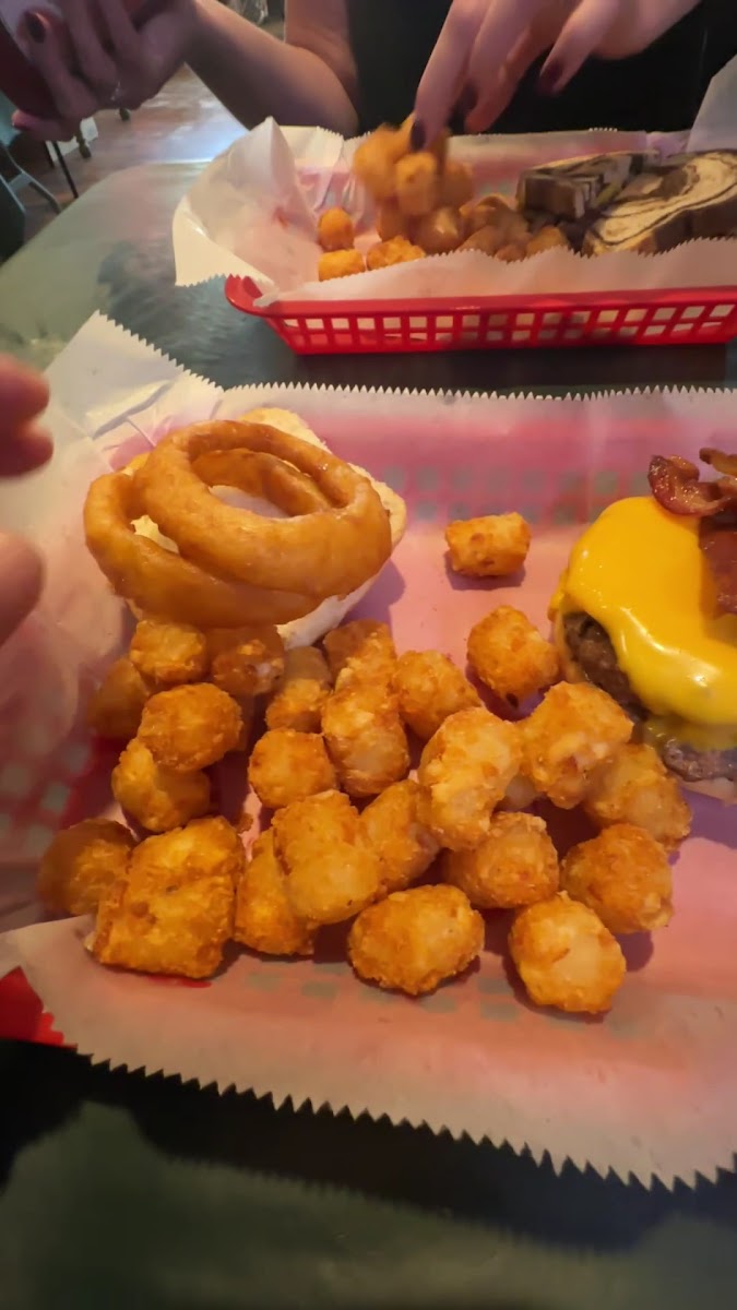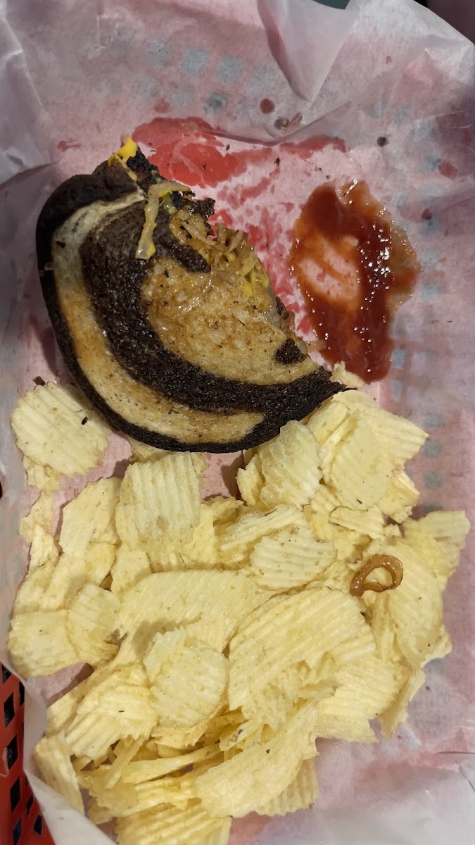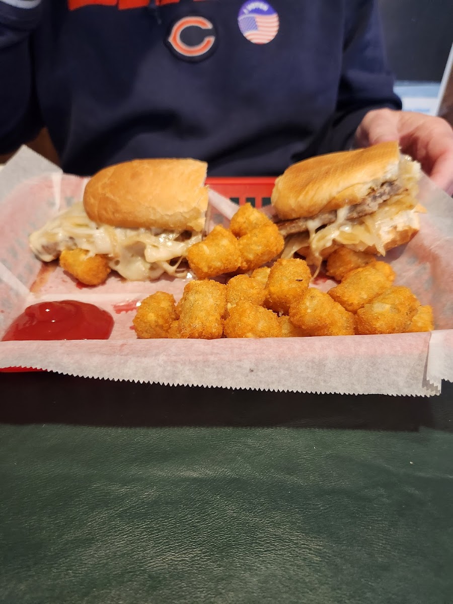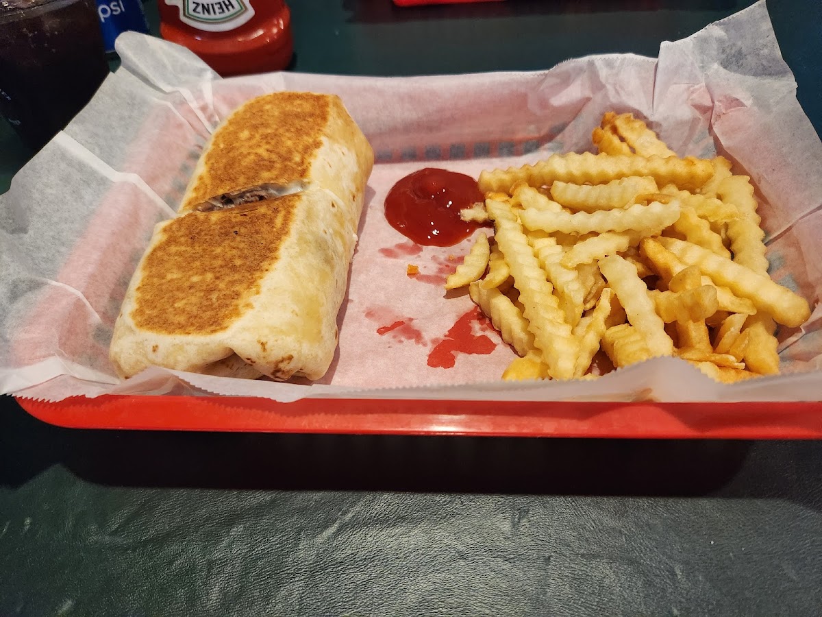 Not fancy, but our server was super friendly and had several recommendations for what to try. There is a bar area and a place with tables. It is a typical small town bar. We came in because the ladies at the polling place were eating takeout from here, and it smelled delicious. They do have slot machines in an area at the back for those that are interested. There was also a little window with color books and crayons and stuff for kids to play with. There was a family eating when we arrived and the kids really seemed to be enjoying their food. There is also a patio area outside for warm days. Food was good. I had the Garlic Beef Wrap that the server recommended. It was excellent! Filled with beef and mozzarella cheese and a nice garlic flavor that was not too overpowering. Served with chips normally, but I added fries for a little extra. My husband got the Poor Boy with tots. He thought it was very good. Lots of grilled onions and cheese which he is a fan of. Overall, very good food that I would definitely recommend. Prices